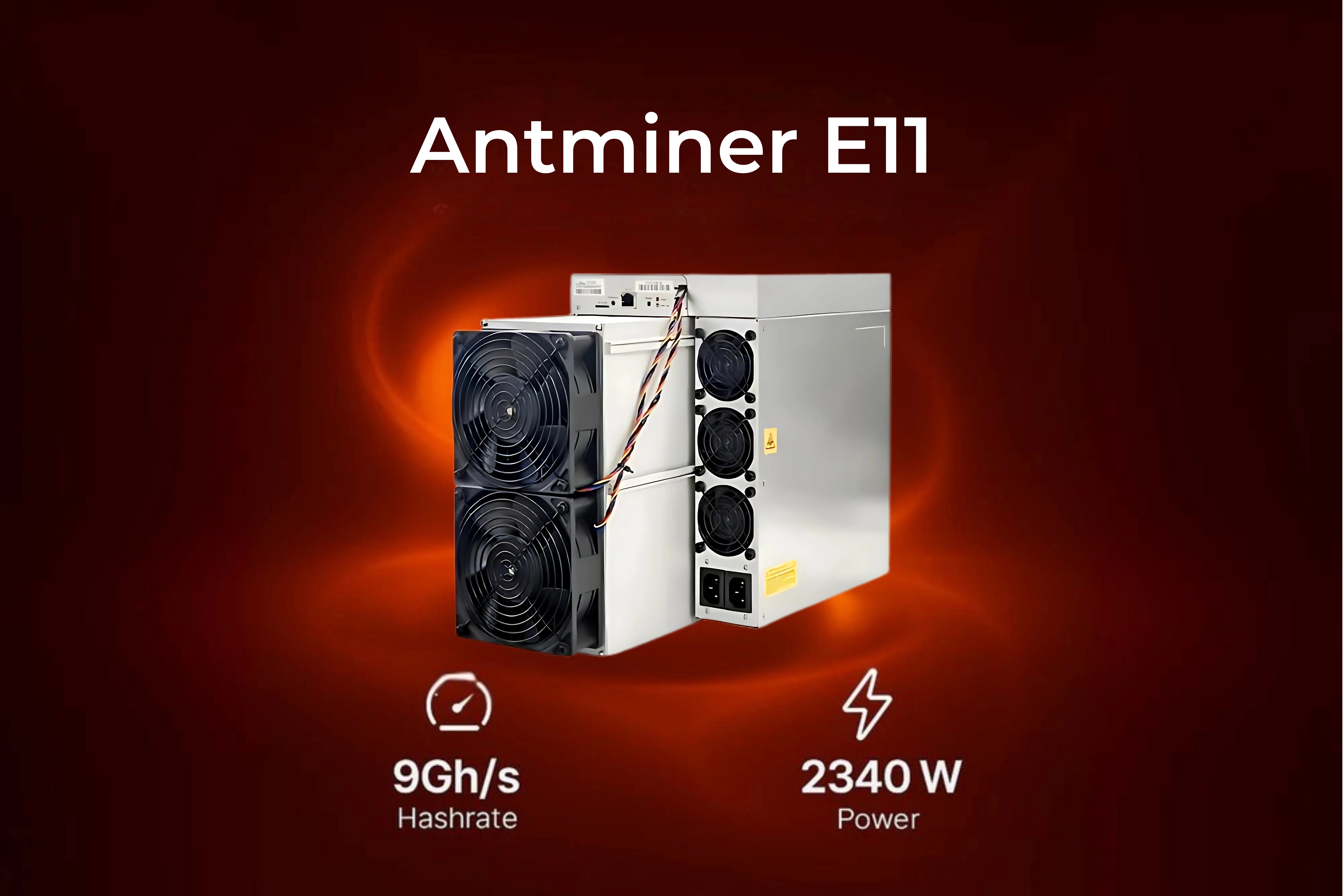 Antminer E11 is manufactured by Bitmain and supports the EtHash algorithm, offering hashrates of 9Gh/s with consistent performance and a power consumption of 2340W.