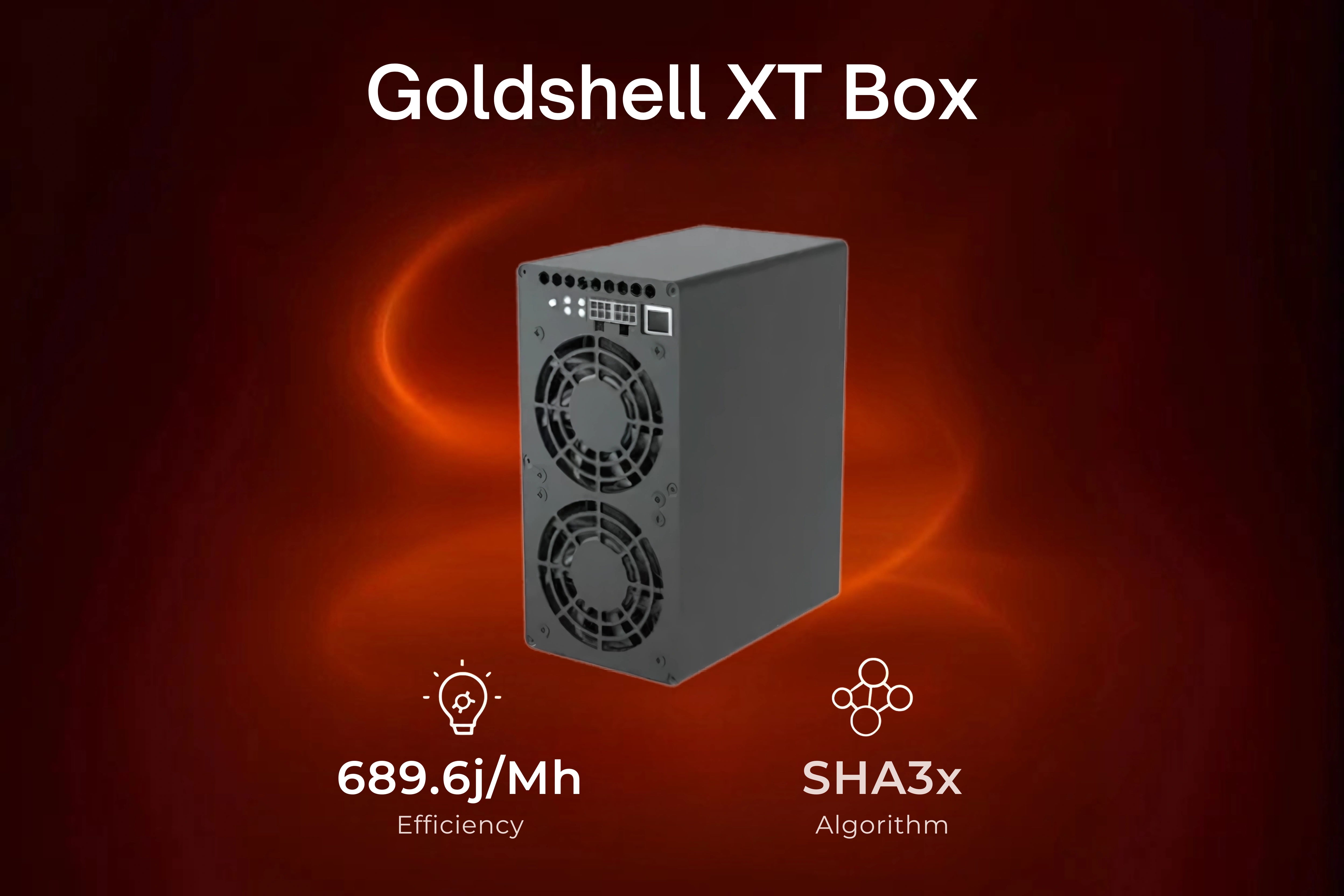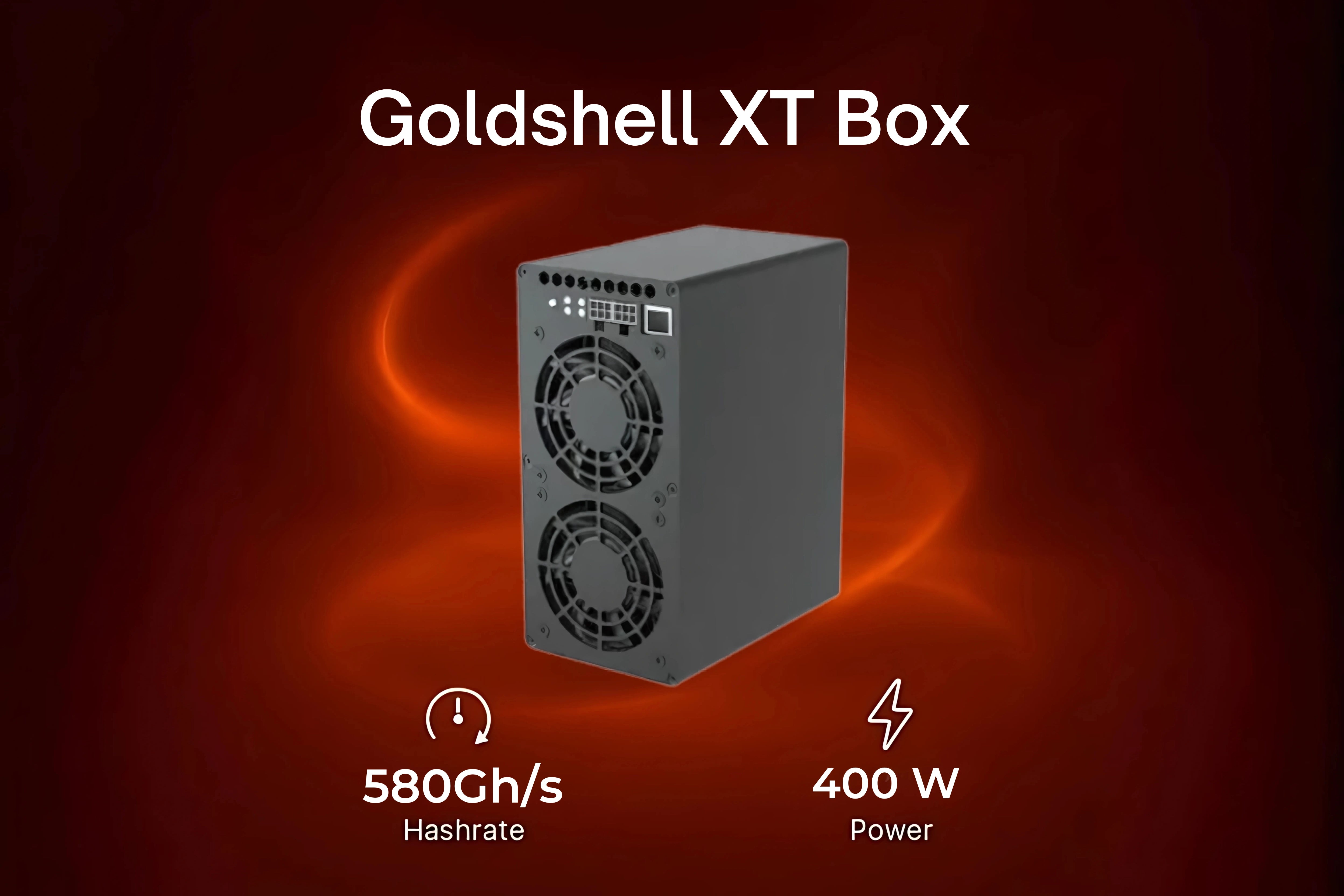 XT Box is manufactured by Goldshell and supports the SHA3x algorithm, offering hashrates of 580Gh/s with consistent performance and a power consumption of 400W.